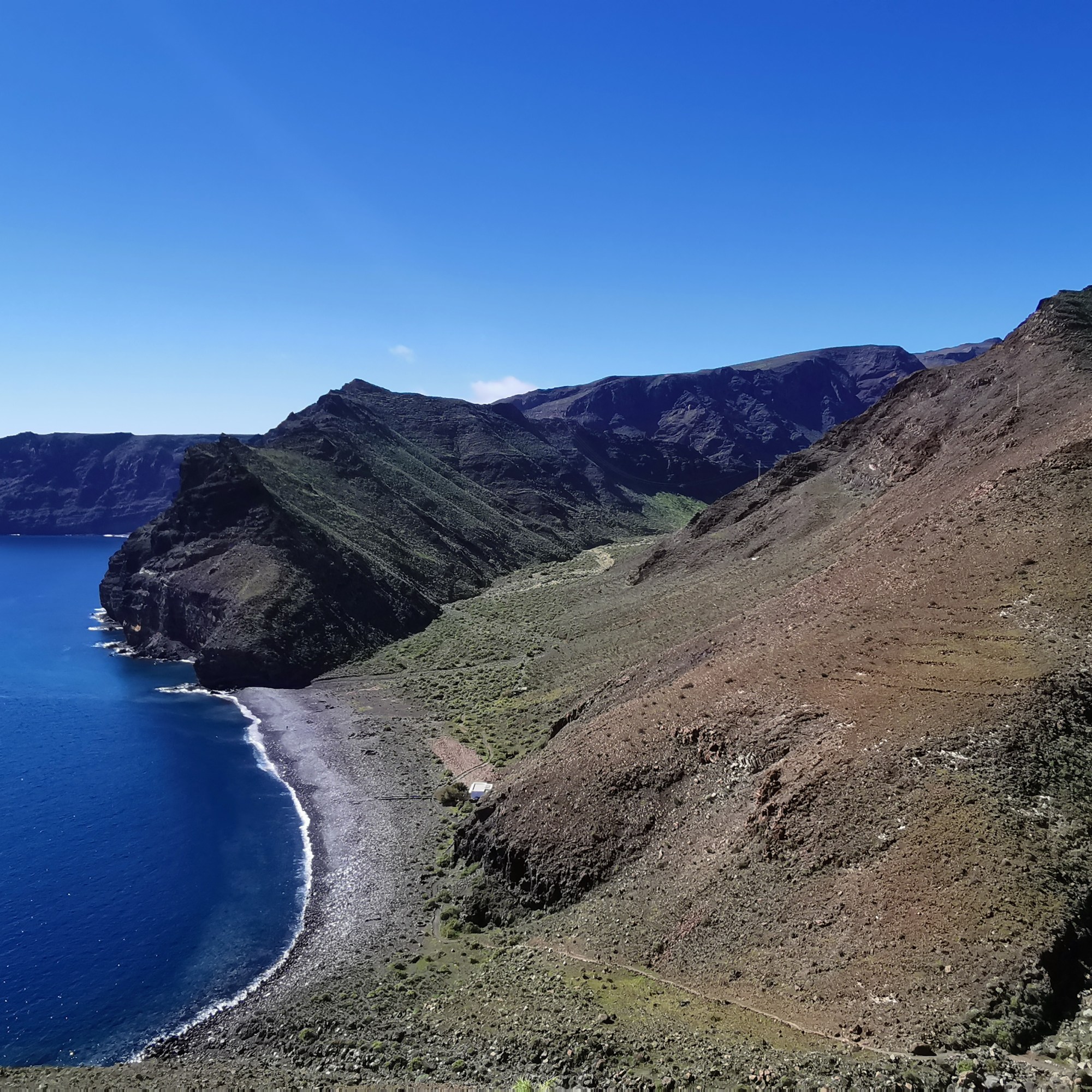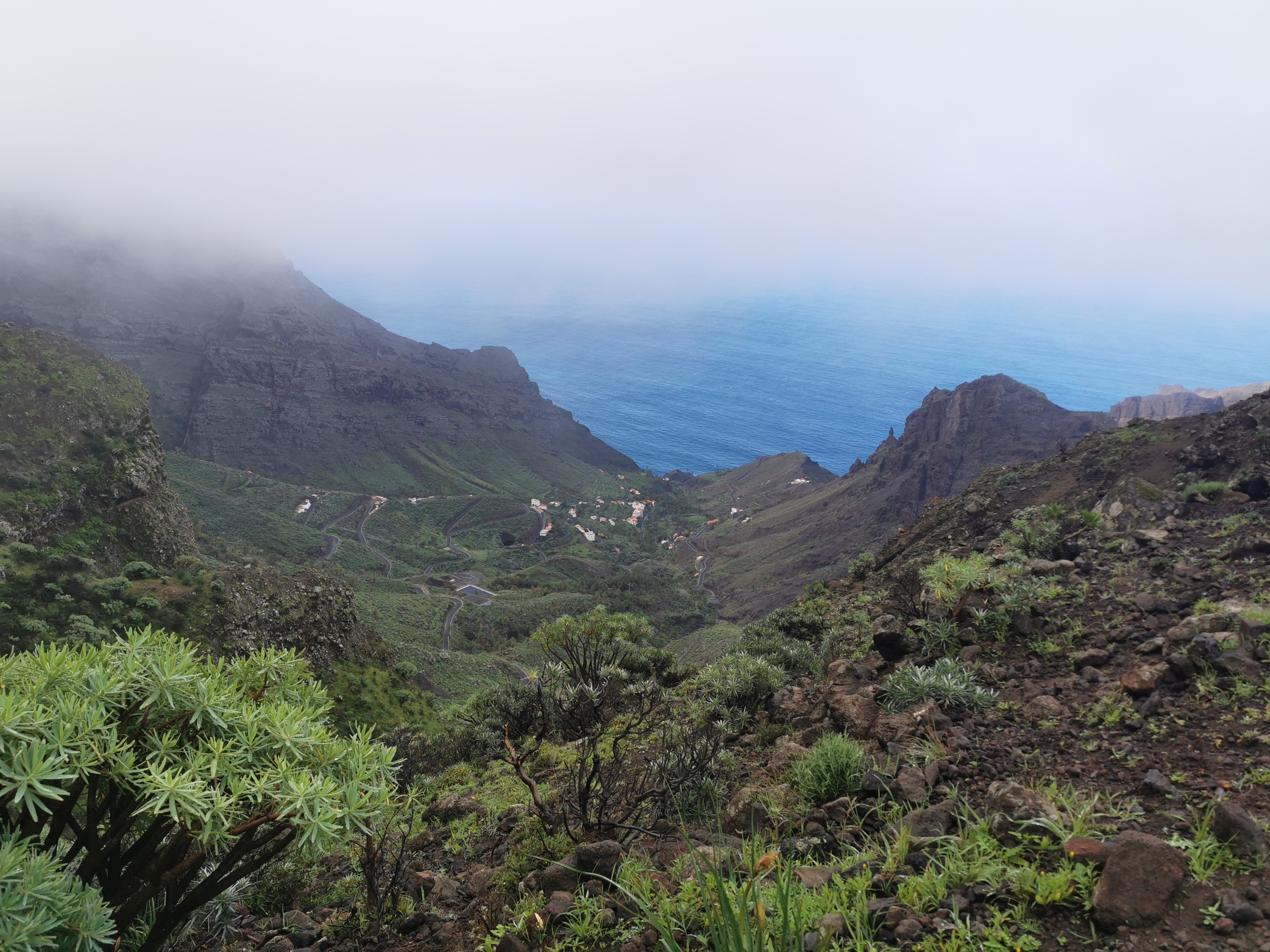 Besides the feelings described above, this day consisted of going up and down along the coast until a final descent towards the capital of La Gomera. The most interesting part of this day were the views towards the human-modified hills surrounding us. Due to its steepness, it’s not possible to directly cultivate on the hills around the island. Therefore, people created these stone-walled terraces to maximize, cultivate, and irrigate land for crops on rugged terrain. They dramatically impact the landscape. Moreover, some of them were quite far from roads, so I got myself often thinking about how difficult, demanding and time consuming it must have been to create such terraces.