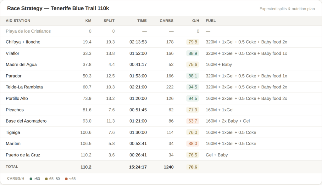 Nutrition: If you follow my Strava, you notice that there’s nothing different from my usual long runs: Maurtens, baby food pouches and SiS Go Gels. I try to keep my nutrition as similar to my training as possible, not only in terms of what I eat but also how much I eat. The table below does not take into account possible snacks at the aid stations, which happens all the time.