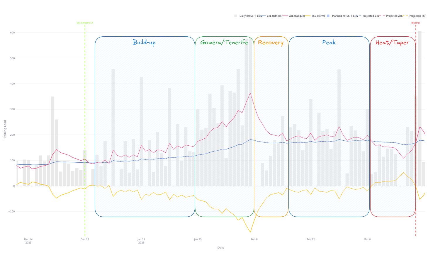 The preparation for this race can be split into 4 different blocks: build-up, La Gomera/Tenerife, peak and taper. My fitness progress and periodization can be clearly seen in the PMC below: a clear build-up in fitness and fatigue and a high peak followed by tapering and increase in form. This supports even more the feeling I had that this was by far my best training cycle ever.